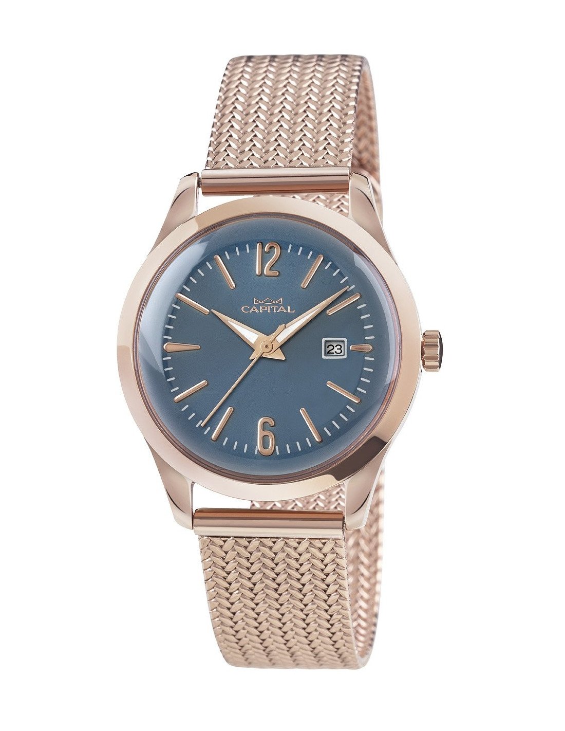 MATERIAL COLOR AND CASE SHAPE Rounded rose-plated steel case