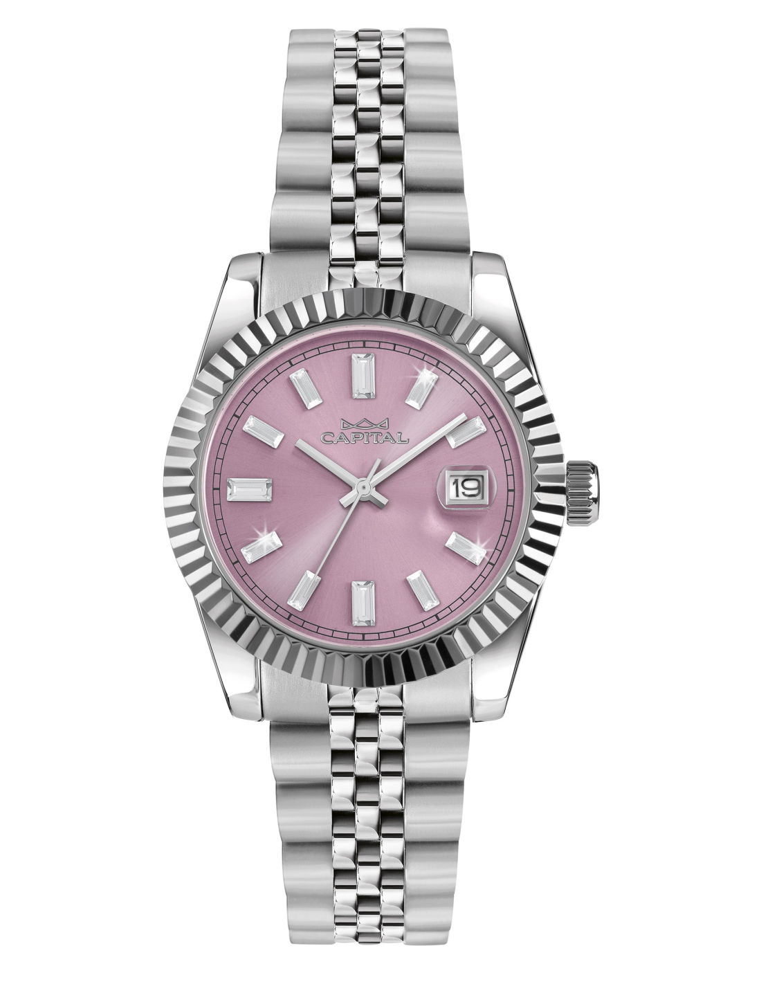 | DIAL | Pink dial with baguette stones |