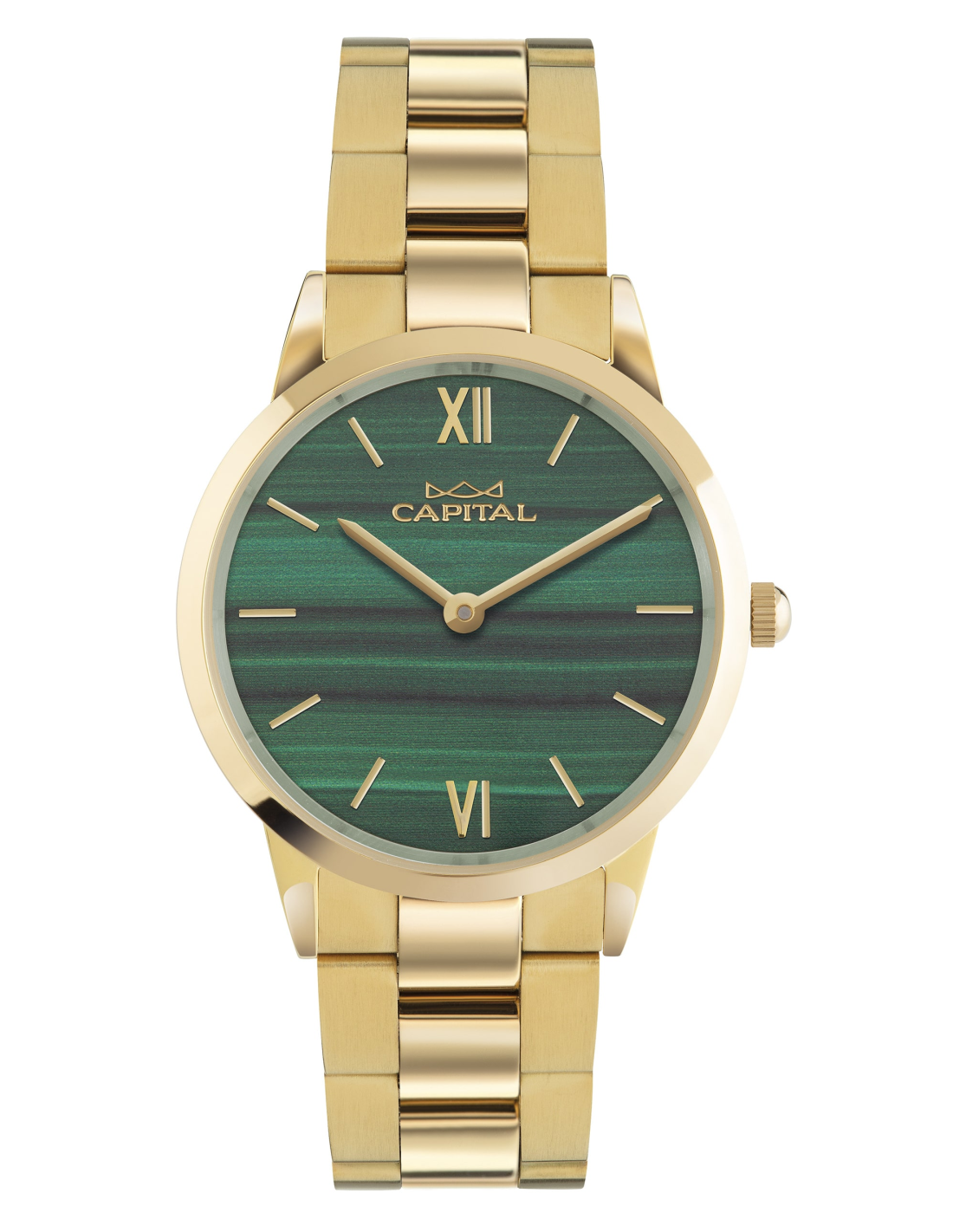 MATERIAL COLOR AND CASE SHAPE Gold rounded-plated steel case