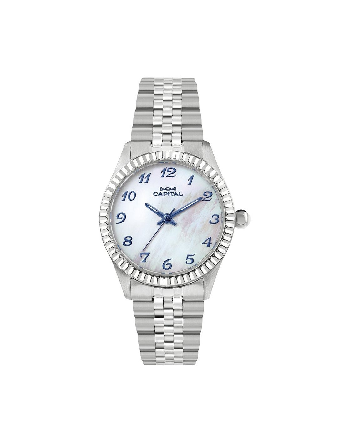 | DIAL | White mother-of-pearl with blue arabic numbers |