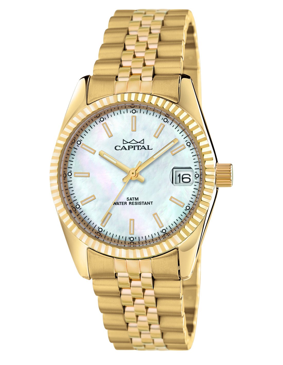 Cassa in acciaio di forma rotonda e fondo a viteMadreperla bianca con indiciBracciale in acciaio GoldBracciale di lunghezza standard con misura estensibileMovimento al quarzo