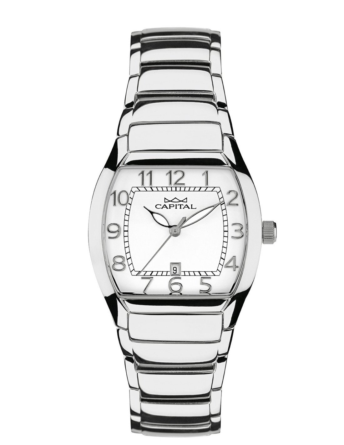 Elegant Capital Toujours watch featuring a rectangular stainless steel case with set side crystals. White dial with Roman numeral hour markers. Stainless steel bracelet with adjustable standard length. Quartz movement for precision and reliability. Perfect for a refined and timeless style.