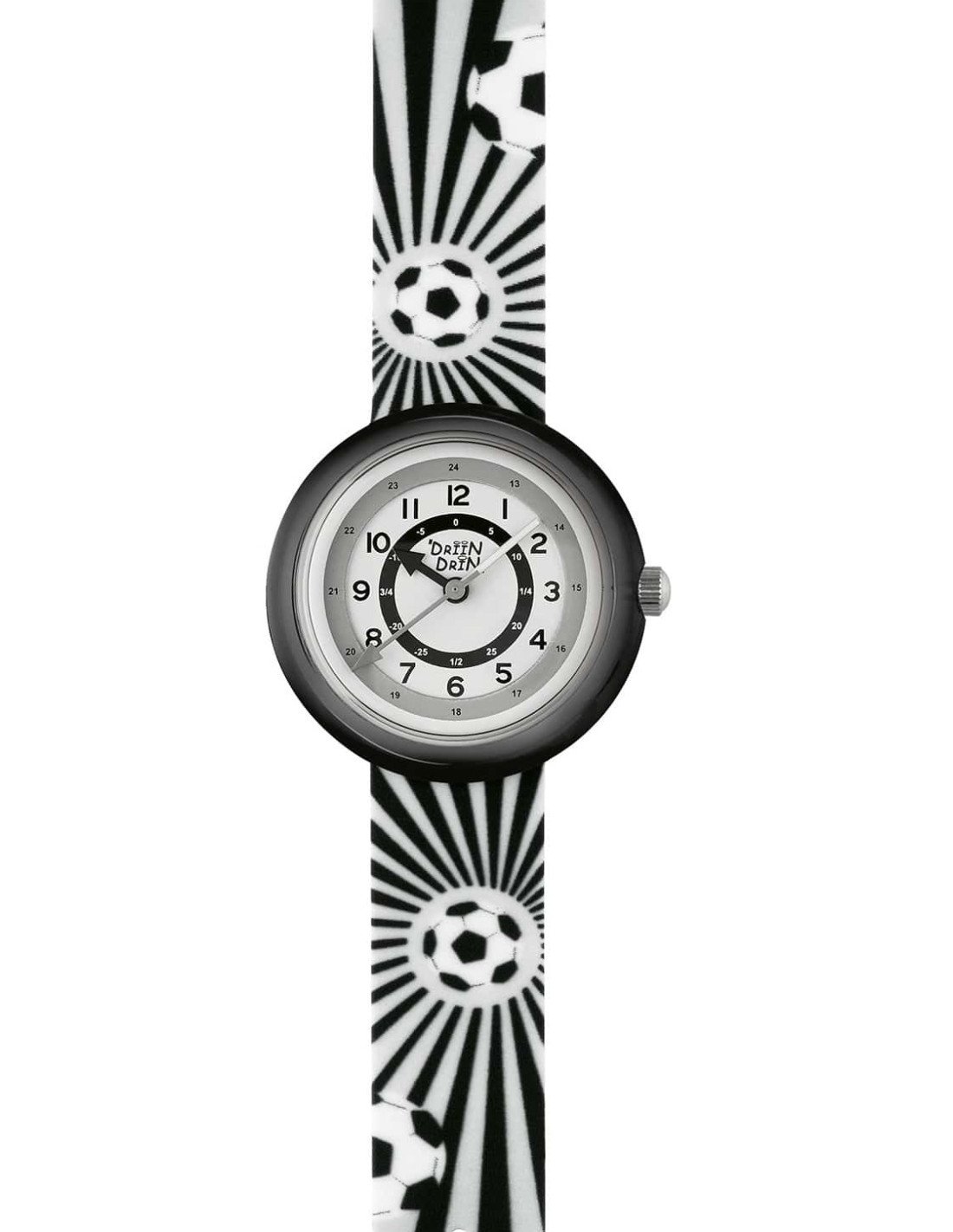 Il compagno perfetto per i piccoli tifosi! Col il suo design accattivante in bianco e nero, questo orologio da polso è ideale per i bambini che vogliono imparare a leggere l'ora divertendosi. Cassa e cinturino in plastica resistente, movimento al quarzo preciso e quadrante facile da leggere: l'orologio perfetto per la scuola e il gioco.